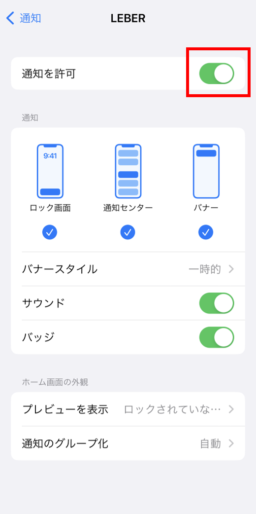 ④「通知を許可」をオンにします。(緑色がオンの状態です。)