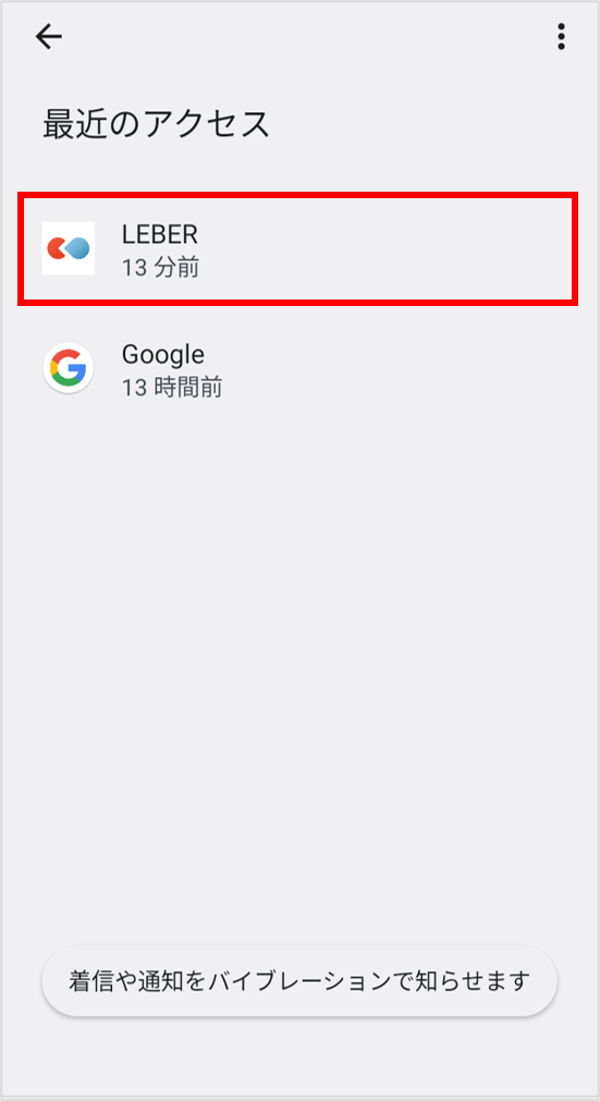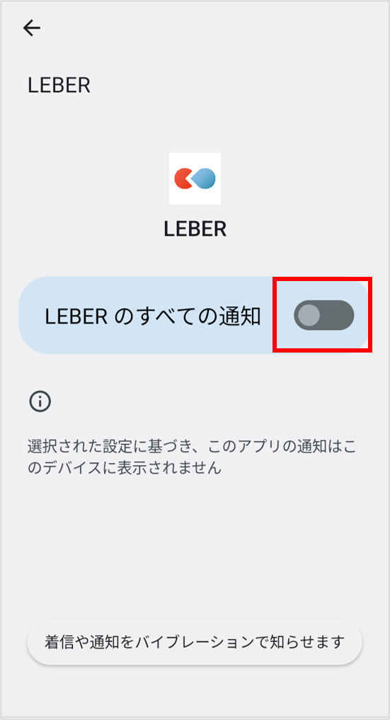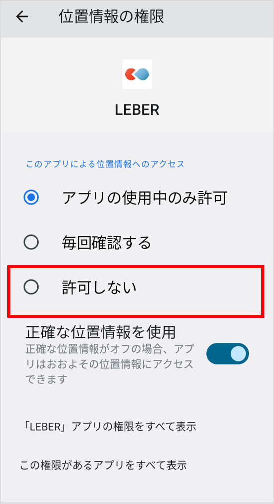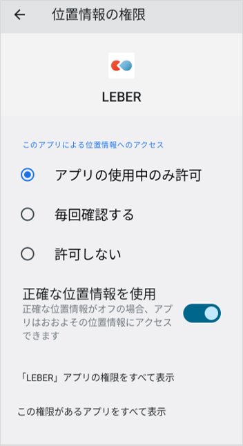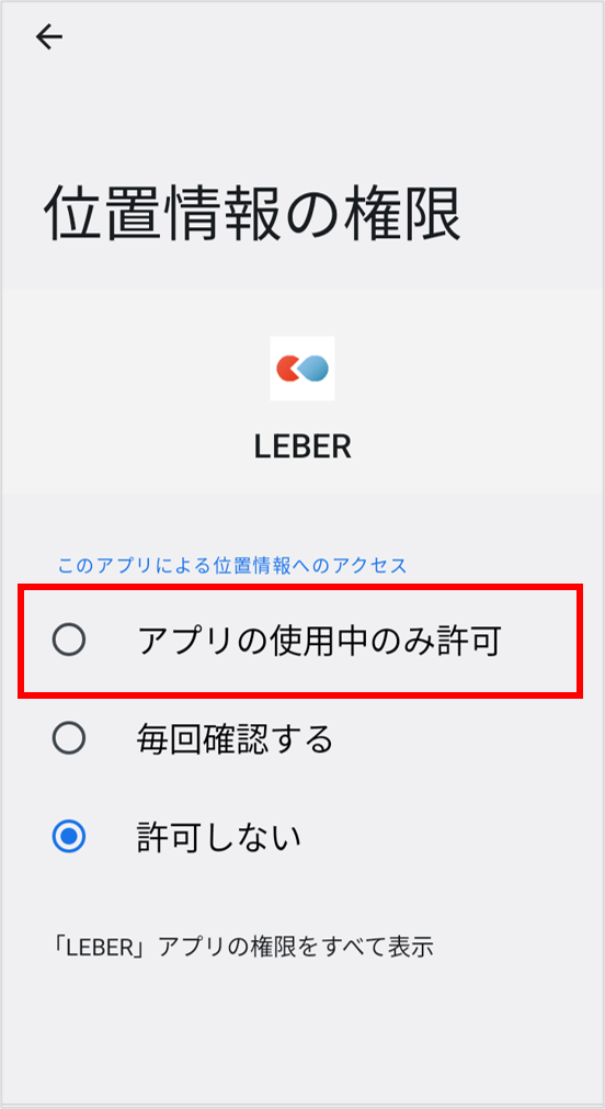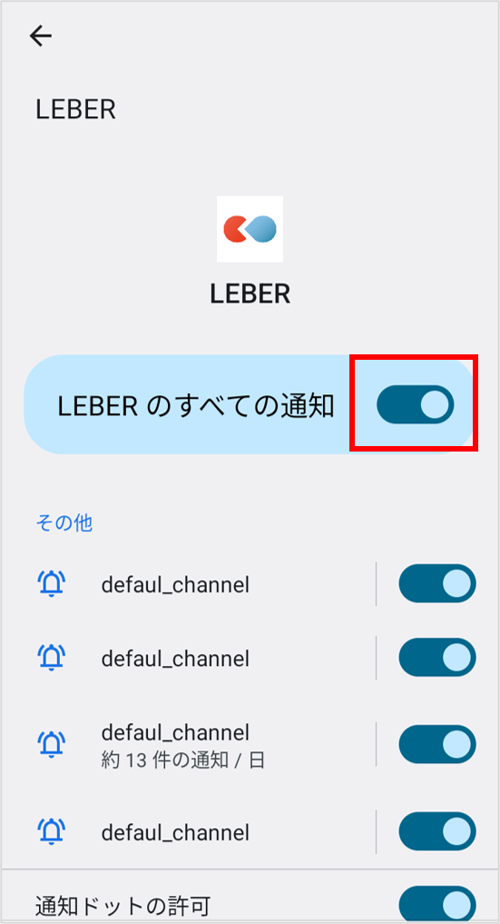 ④「LEBERのすべての許可」をオンにします。(青色がオンの状態です。)