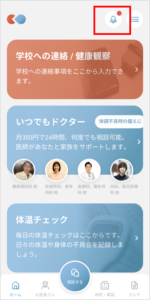 ①アプリホーム画面を開きベルのマークを押します。