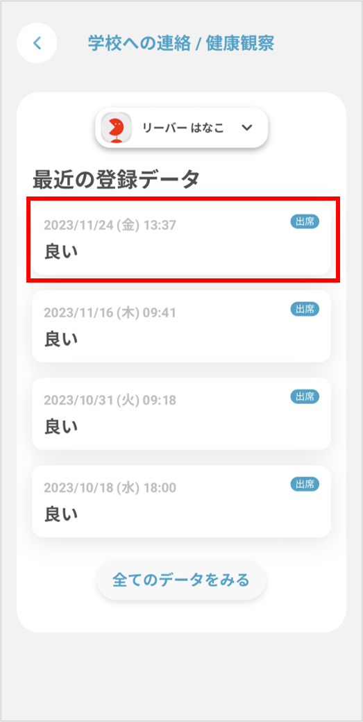 「学校への連絡/健康観察」よりご入力いただいた内容は、以下の手順でご覧いただけます。