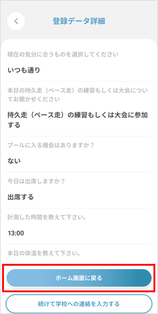 ⑥入力した内容が表示されます。ホーム画面へ戻るを押すと、普段ご利用の画面に戻ります。