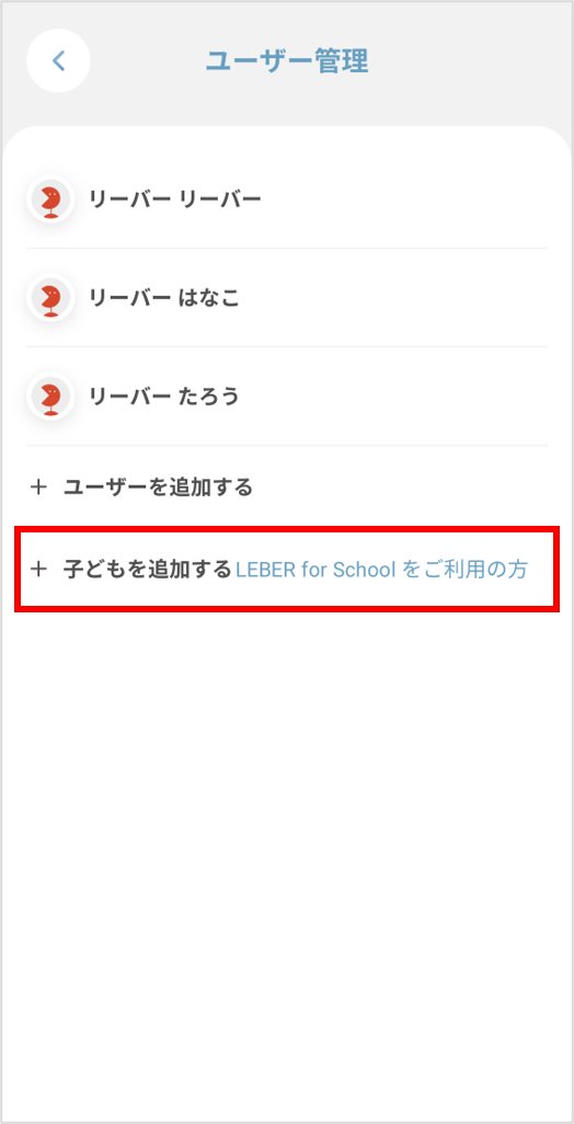 ③「+子どもを追加する LEBER for Schoolをご利用の方」を押します。