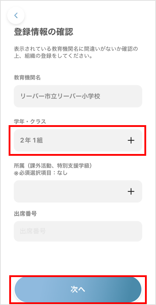 ⑦学年・クラスと出席番号を入力後「次へ」を押します。
