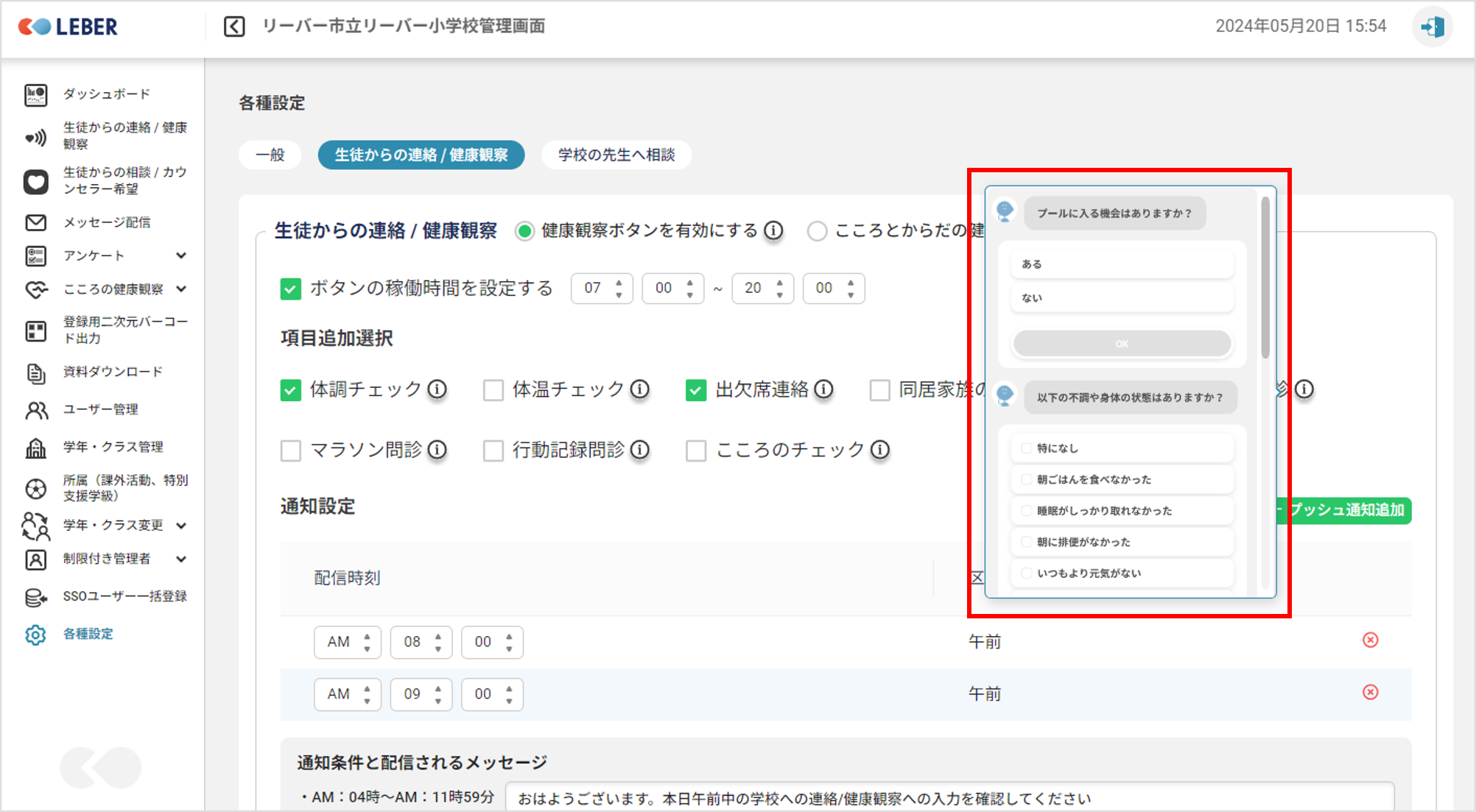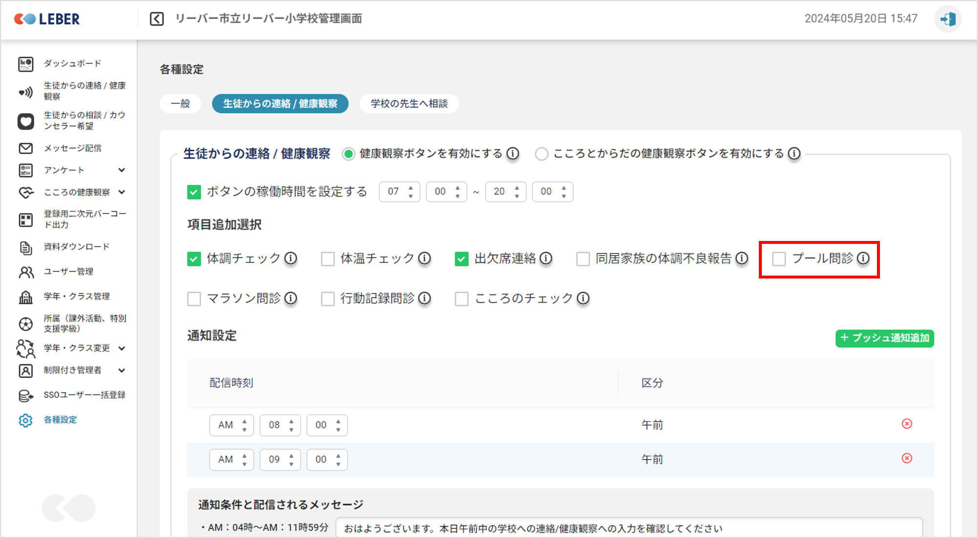 この機能により、プール授業が開催される日に、参加不参加を問うプール問診を健康観察と共に行っていただけます。