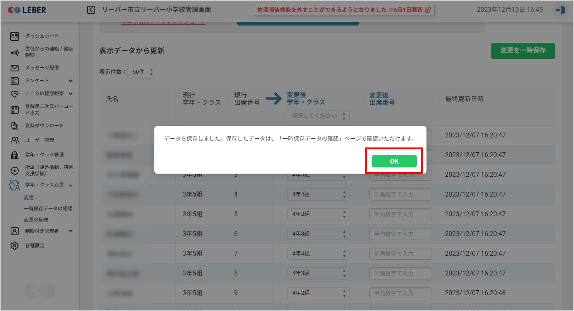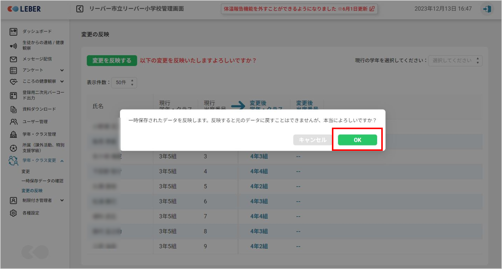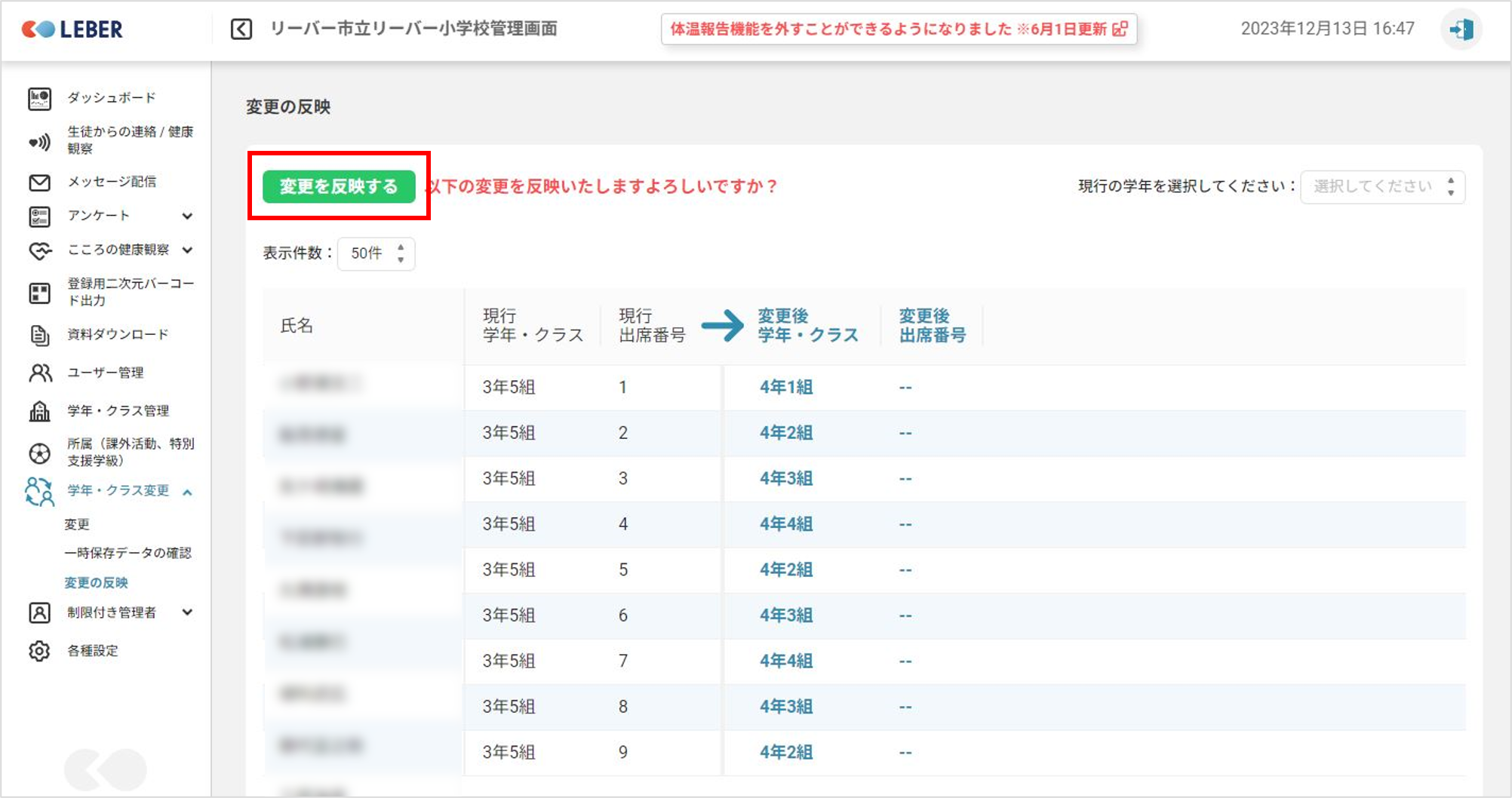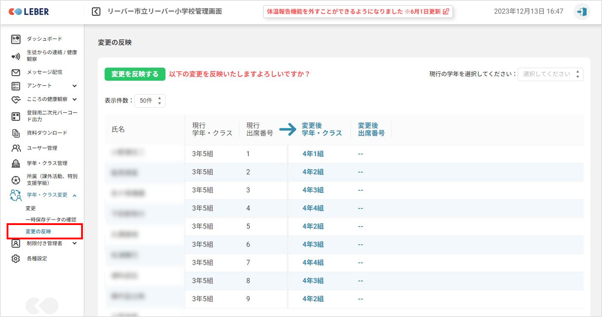 変更を反映すると、保護者のアプリにも反映されます。反映は始業式にてクラス編成が児童・生徒へ共有された後に実行することをお勧めします。
