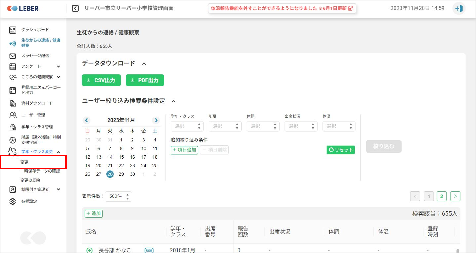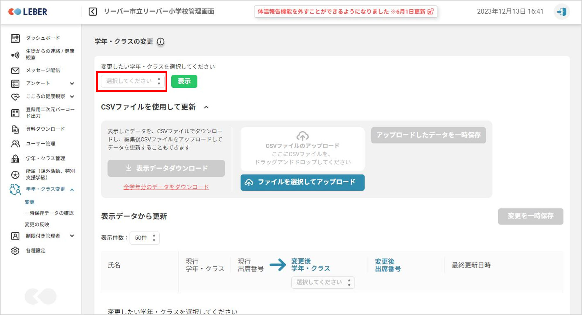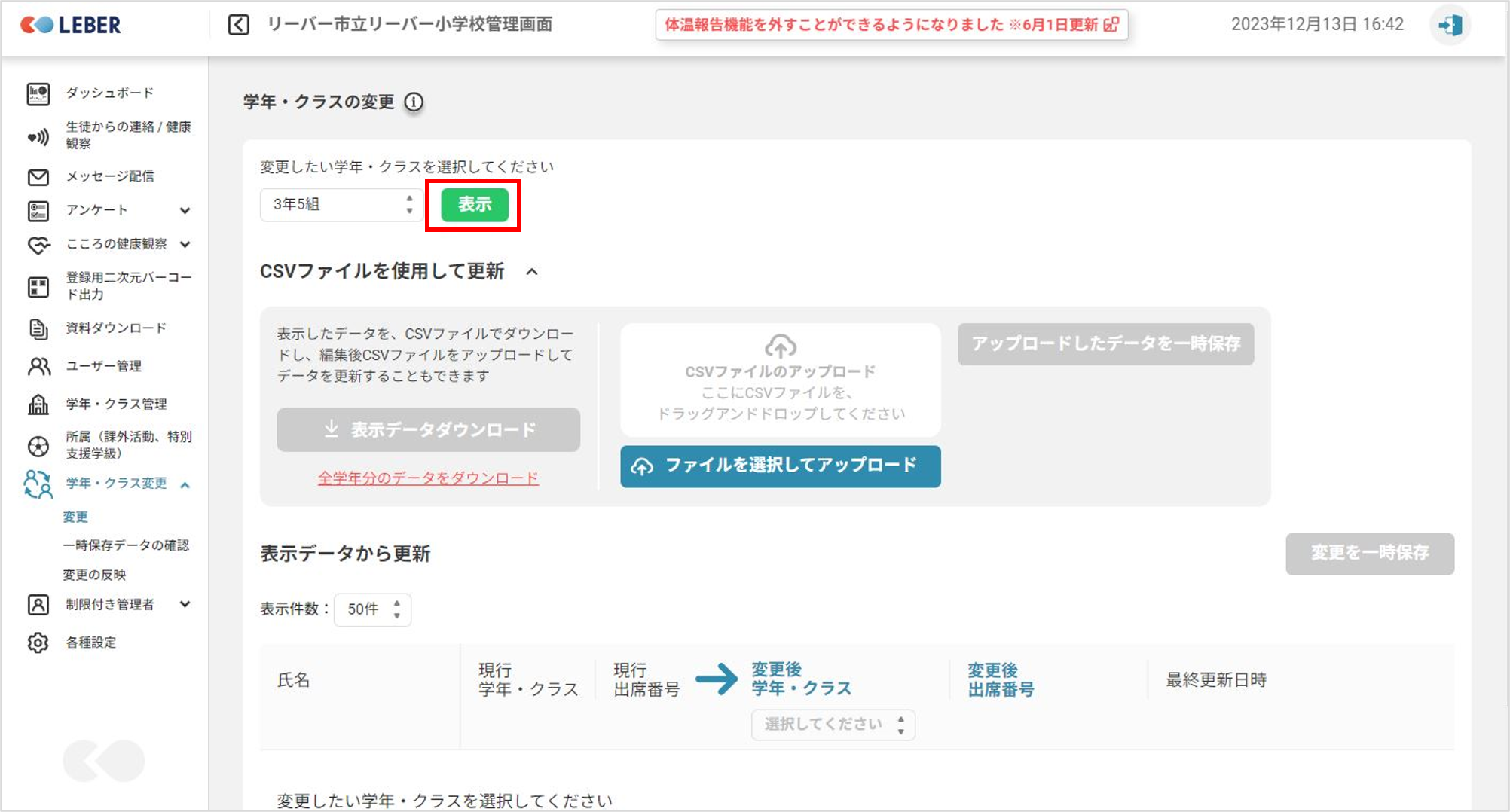 ①管理画面を開き「学年・クラス変更」をクリックします。