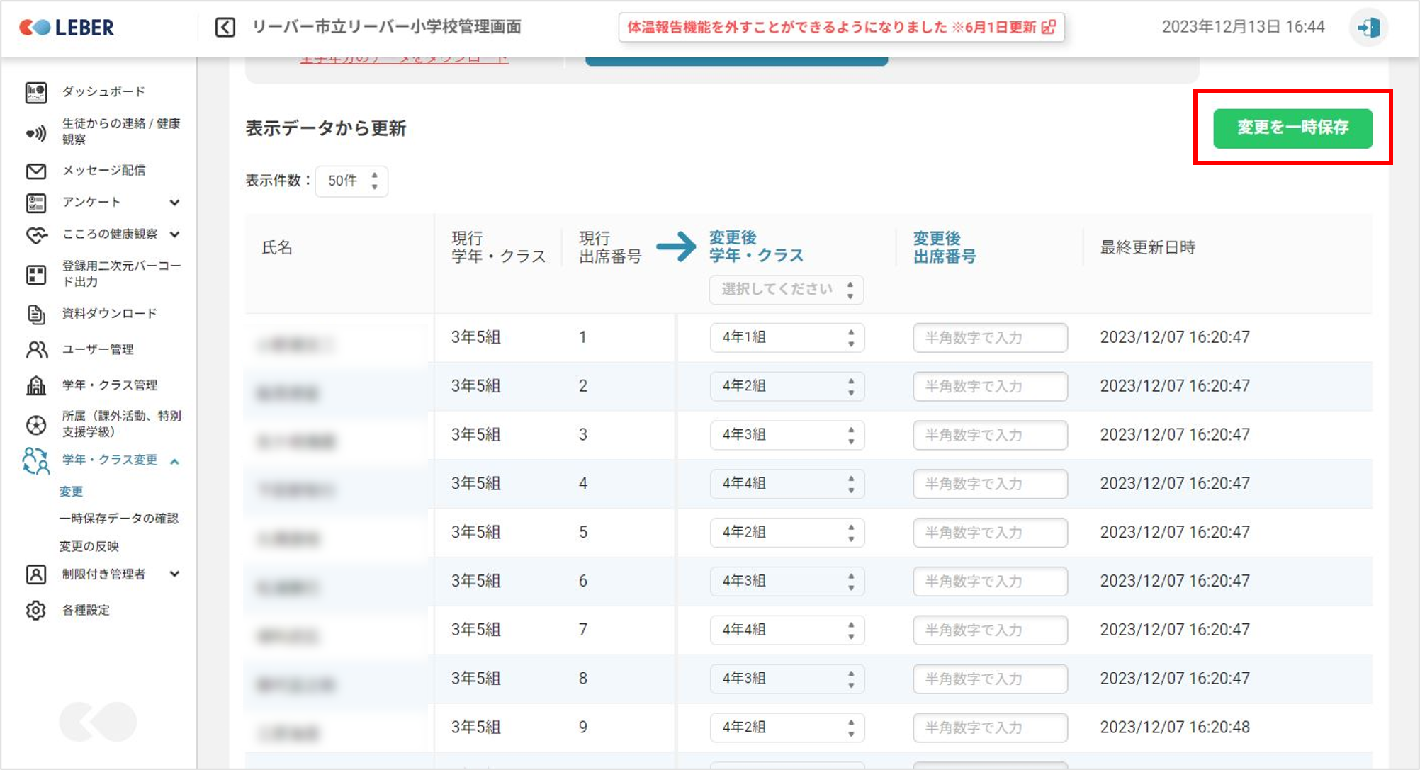 ⑤変更後学年クラス・変更後出席番号に、新しい学年・クラス・出席番号を入力します。