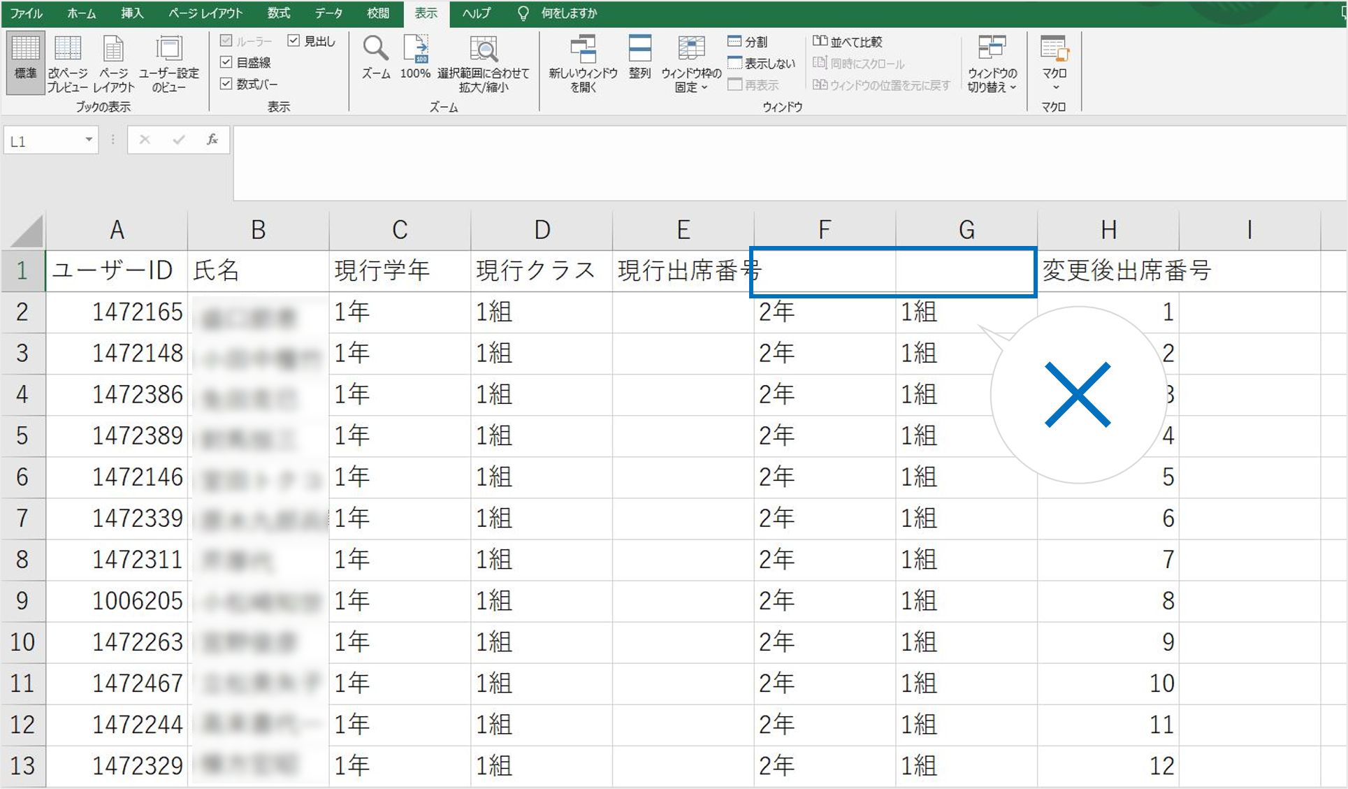 【4】有効なヘッダーではございません。 2025年05月19日 10:36 【4】有効なヘッダーではございません。 考えられる原因①:1行目の見出しが空白、または他の文字が入力されている 1行目の見出しが空白、または他の文字が入力されている場合、エラーの原因となります。 正しい例 1行目の見出しは編集しないでください。 関連記事 管理画面新機能のお知らせ メッセージ送信履歴の確認 学年クラス変更・卒業退職処理(CSVファイル使用)