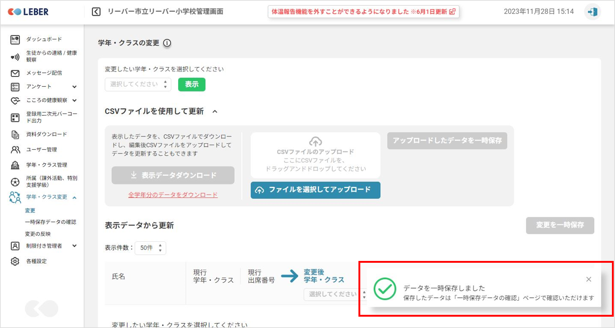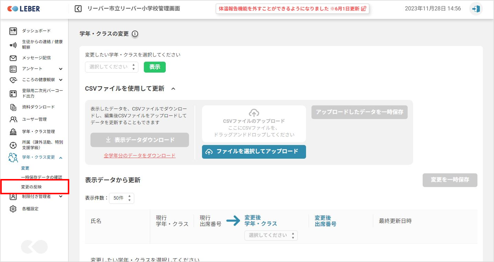 ①管理画面を開き「学年・クラス変更」をクリックします。