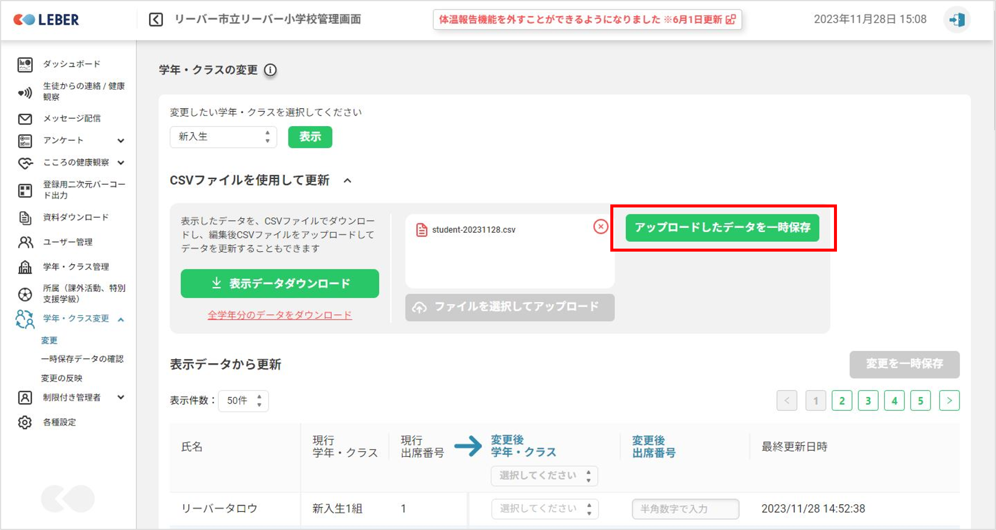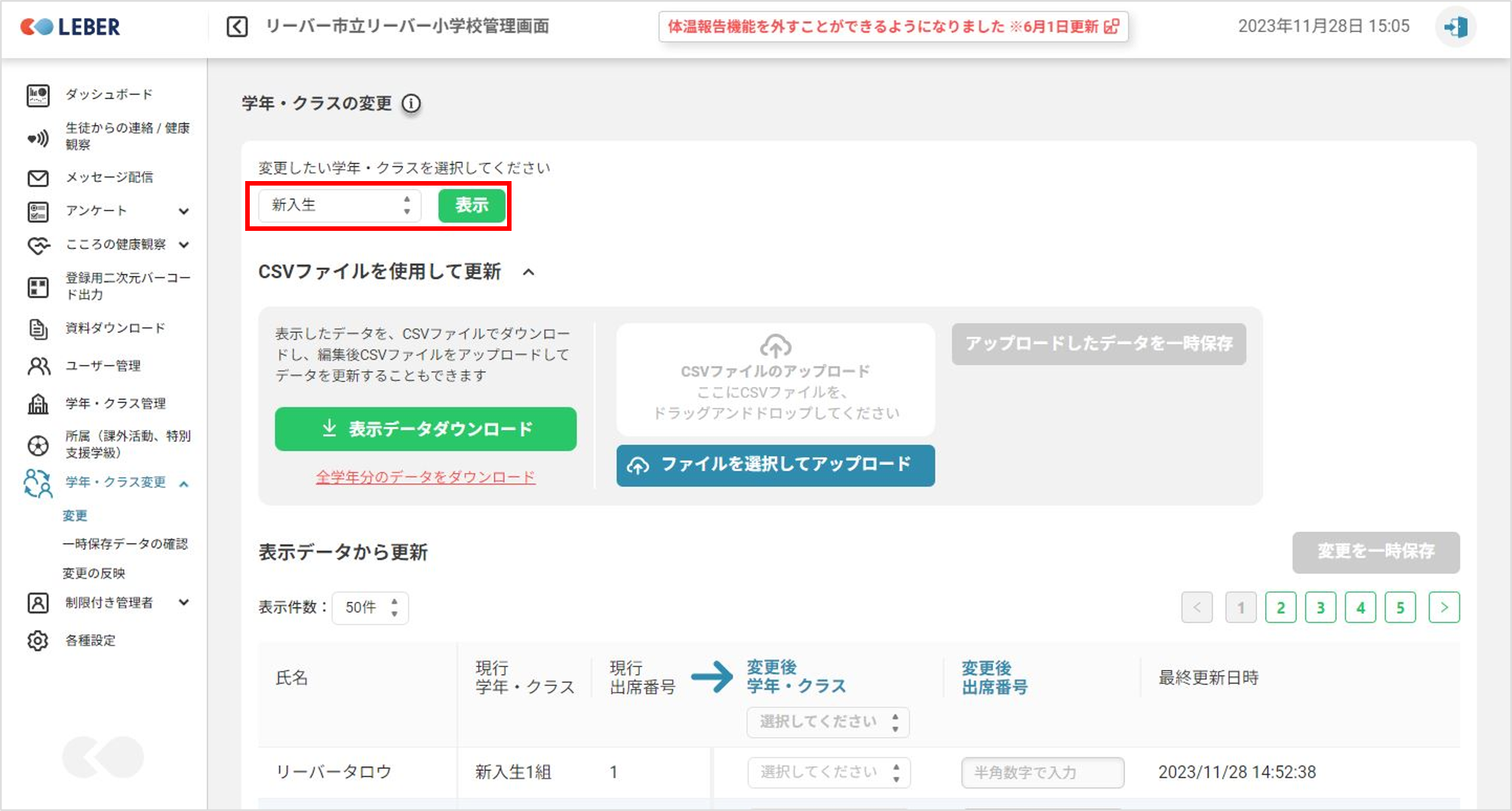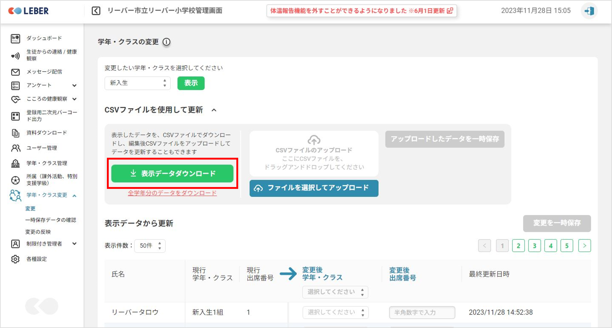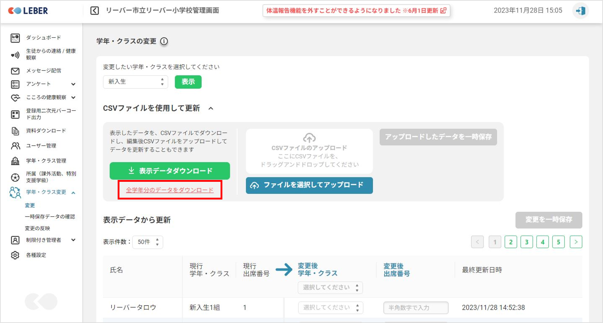 ⑤全校生徒の変更を行う場合は「全学年分のデータダウンロード」をクリックします。