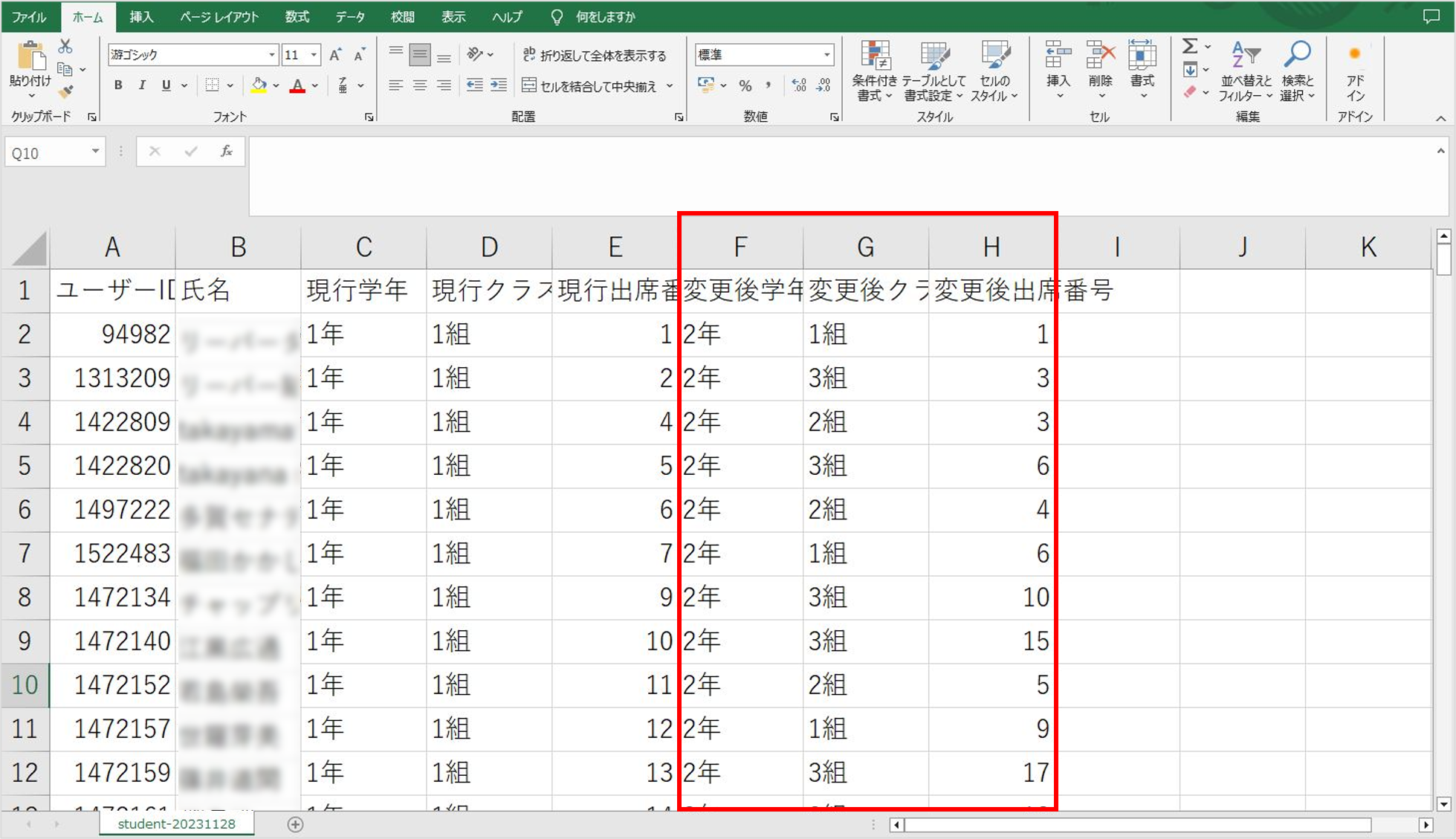 ⑦F~H列に新しい学年・クラス・出席番号を入力し、保存します。