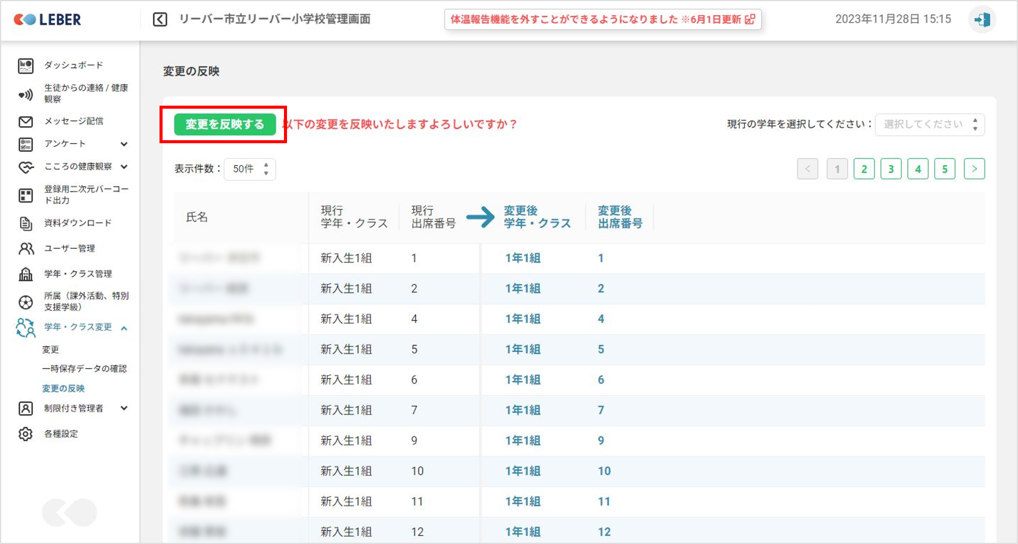 変更を反映すると、保護者のアプリにも反映されます。反映は始業式にてクラス編成が児童・生徒へ共有された後に実行することをお勧めします。