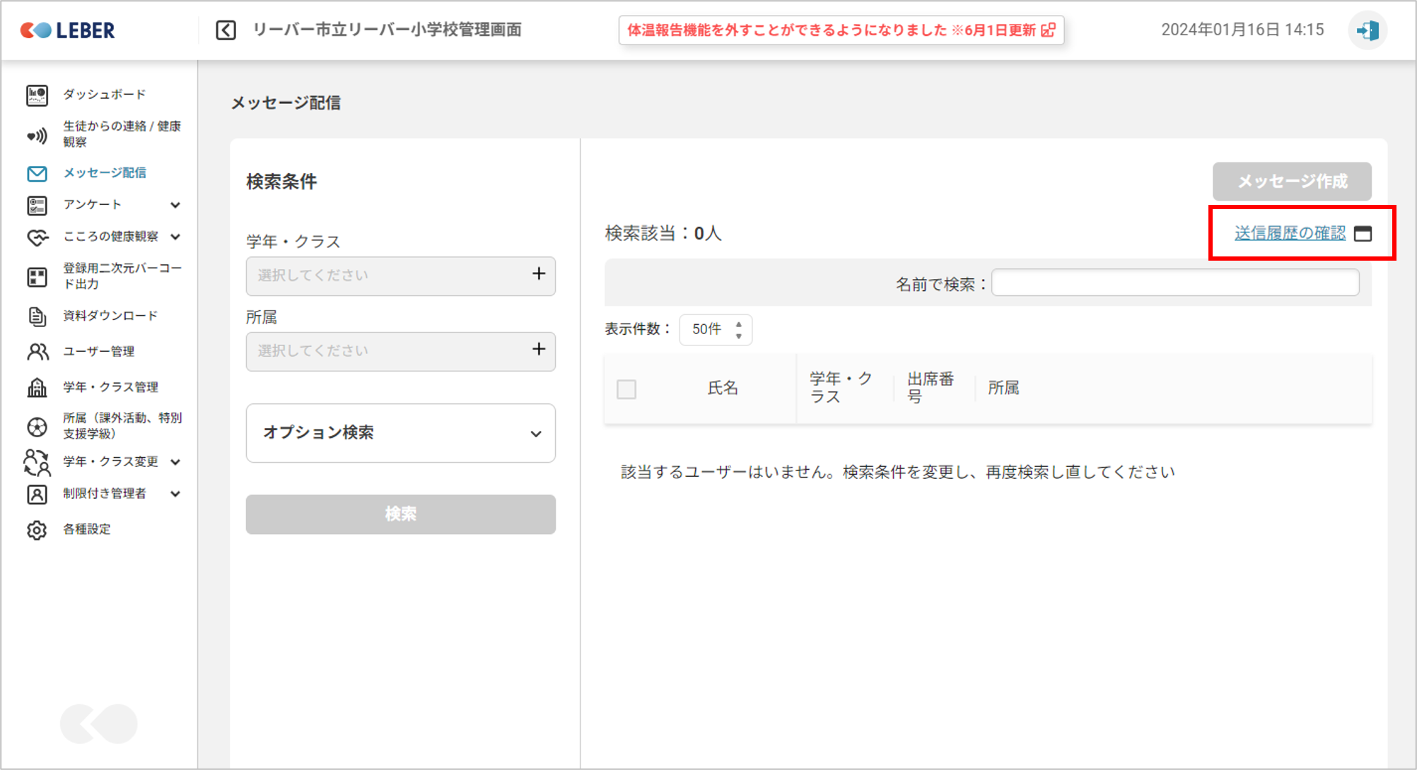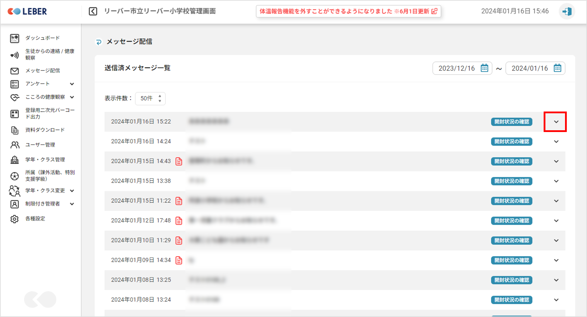③右の赤枠部分をクリックすると、送信したメッセージが表示されます。