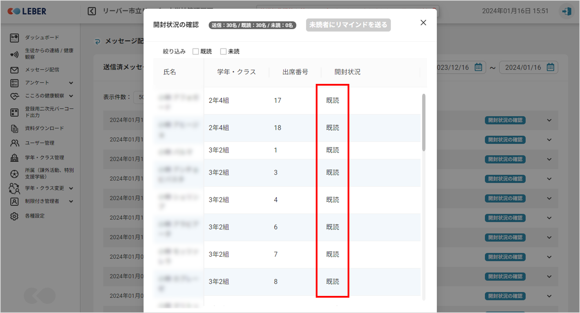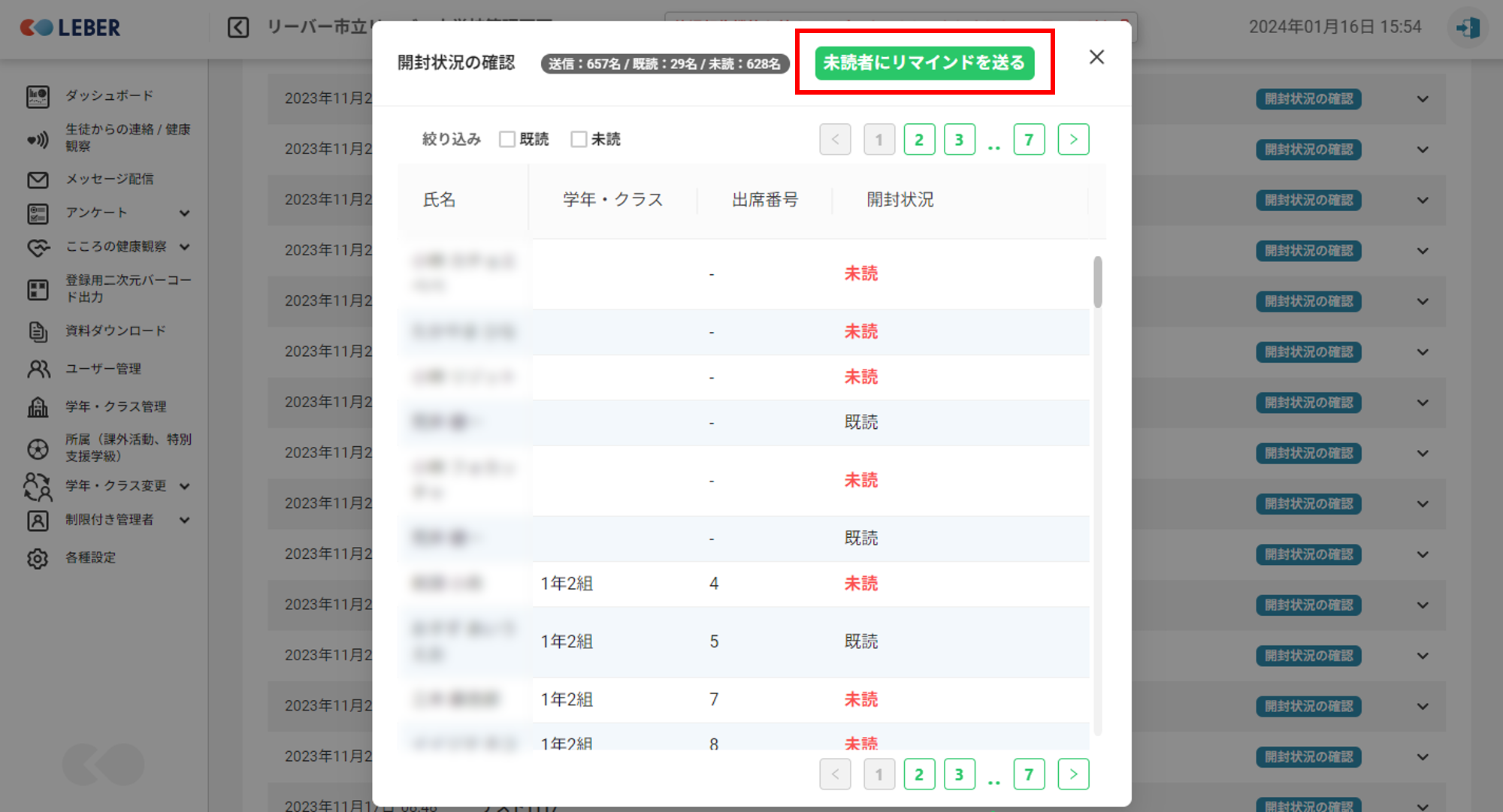 ⑥「未読者にリマインドを送る」より未読者にリマインド通知(プッシュ通知)を送る事も可能です。