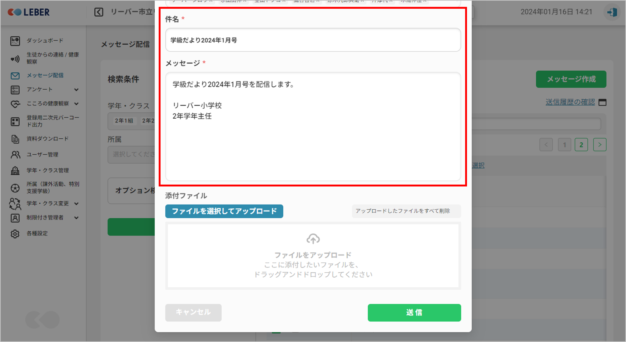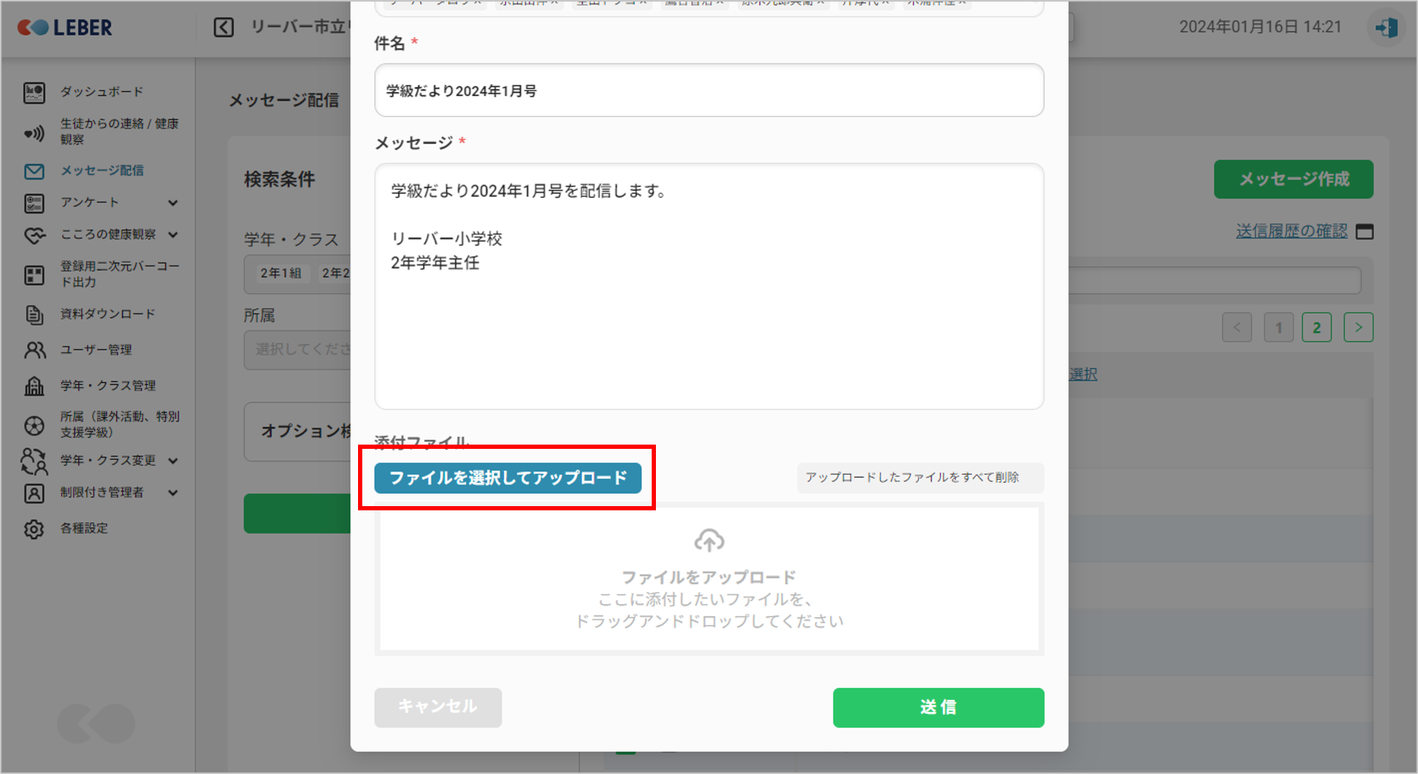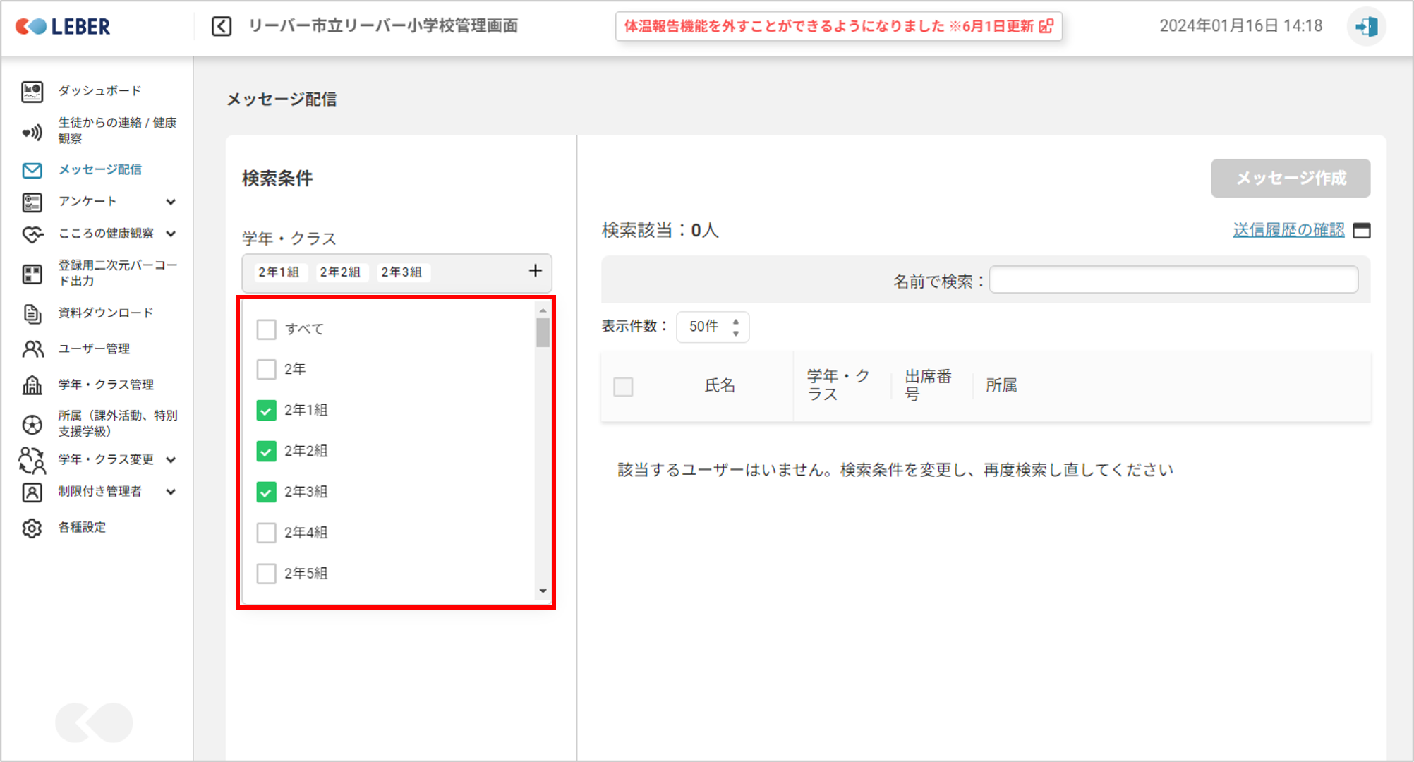 ③送信したい学年・クラスにチェックボックスをつけます。