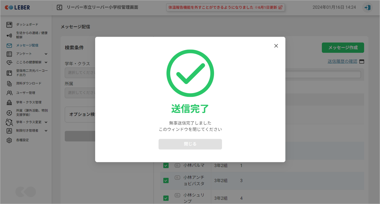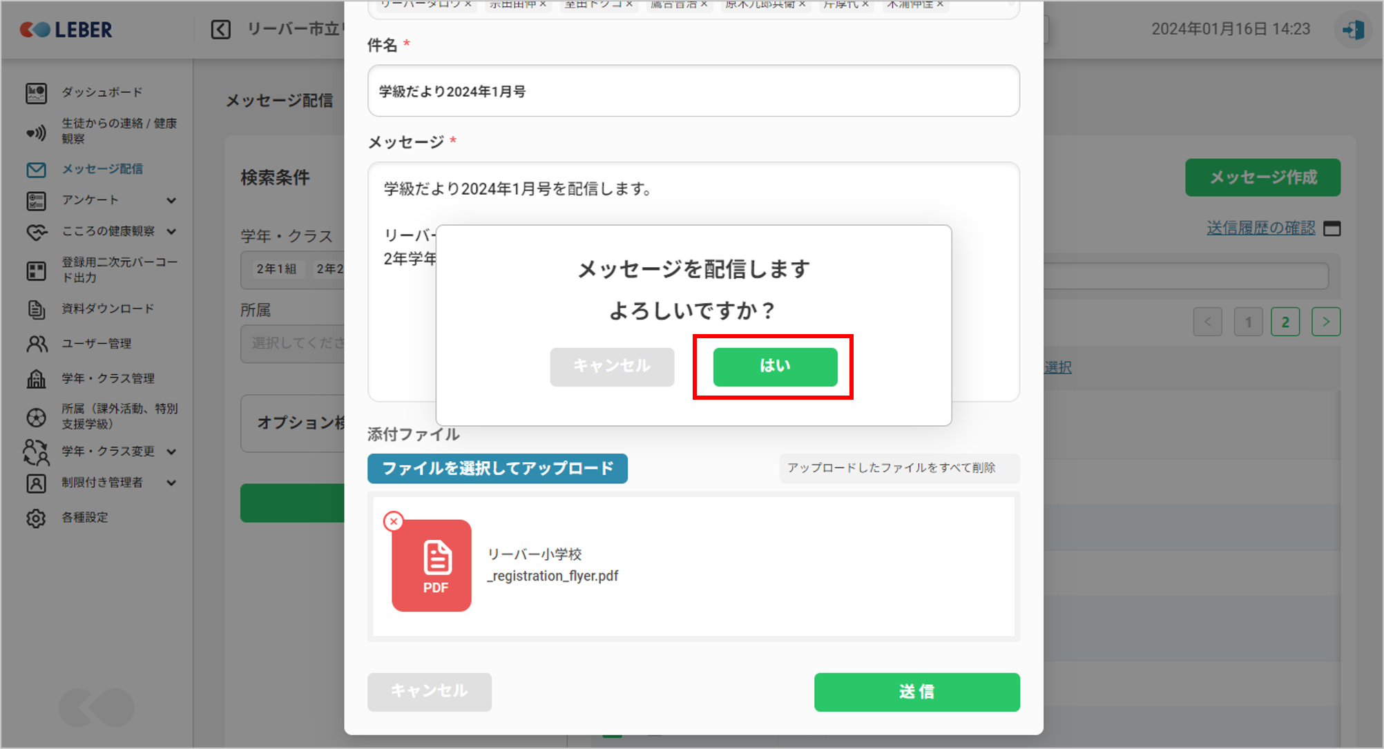 「はい」をクリックすると、メッセージが送信されます。