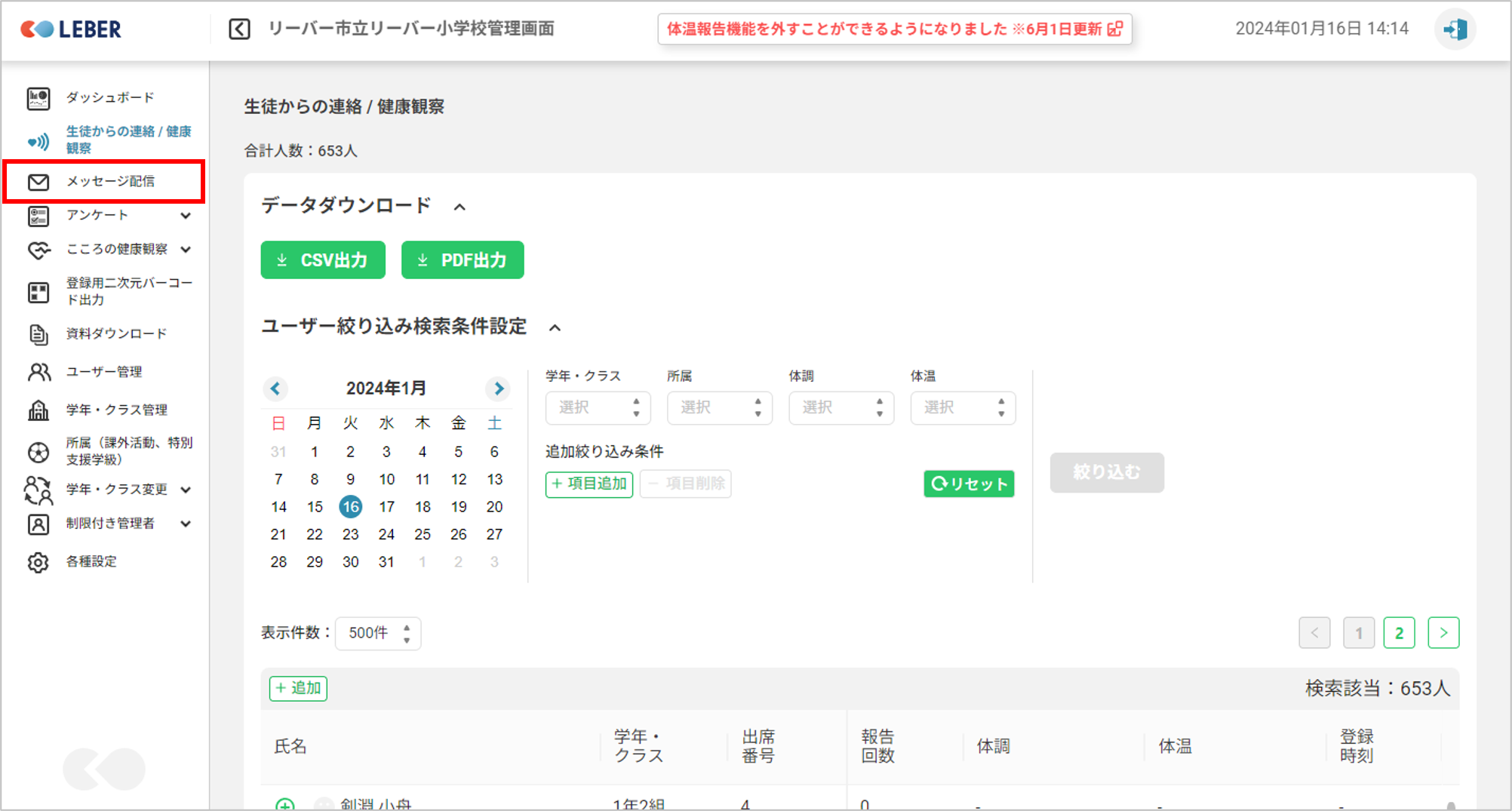 ①管理画面を開き、「メッセージ配信」をクリックします。
