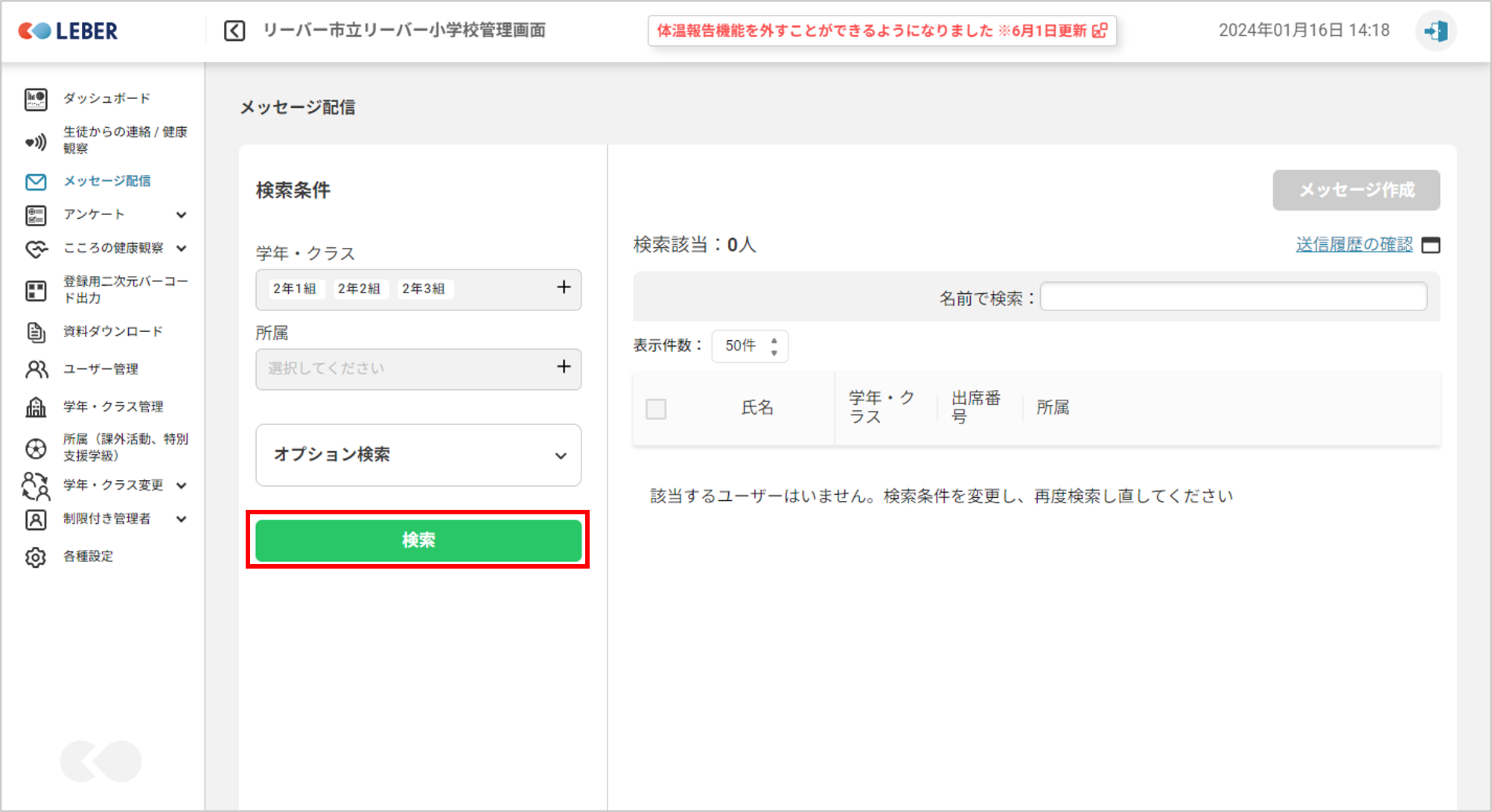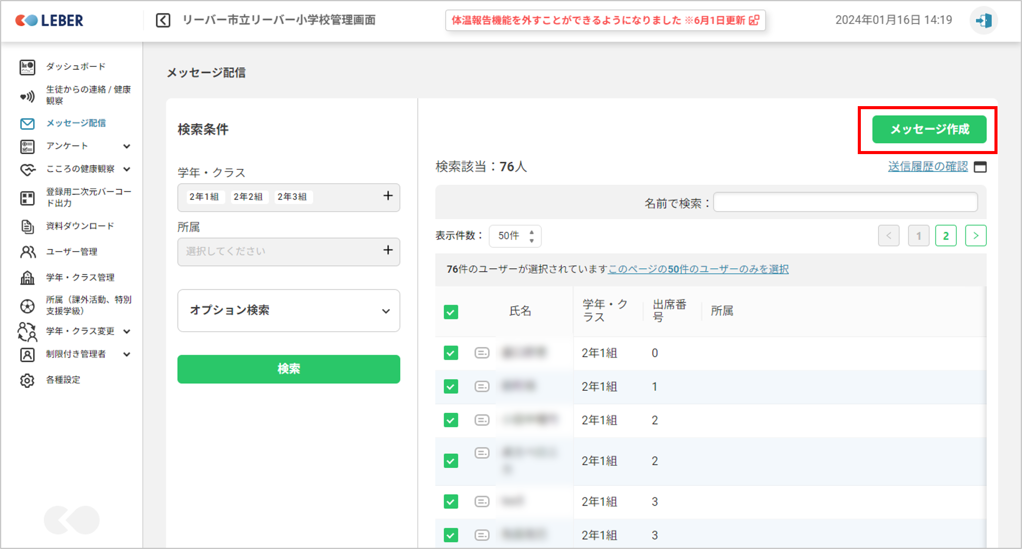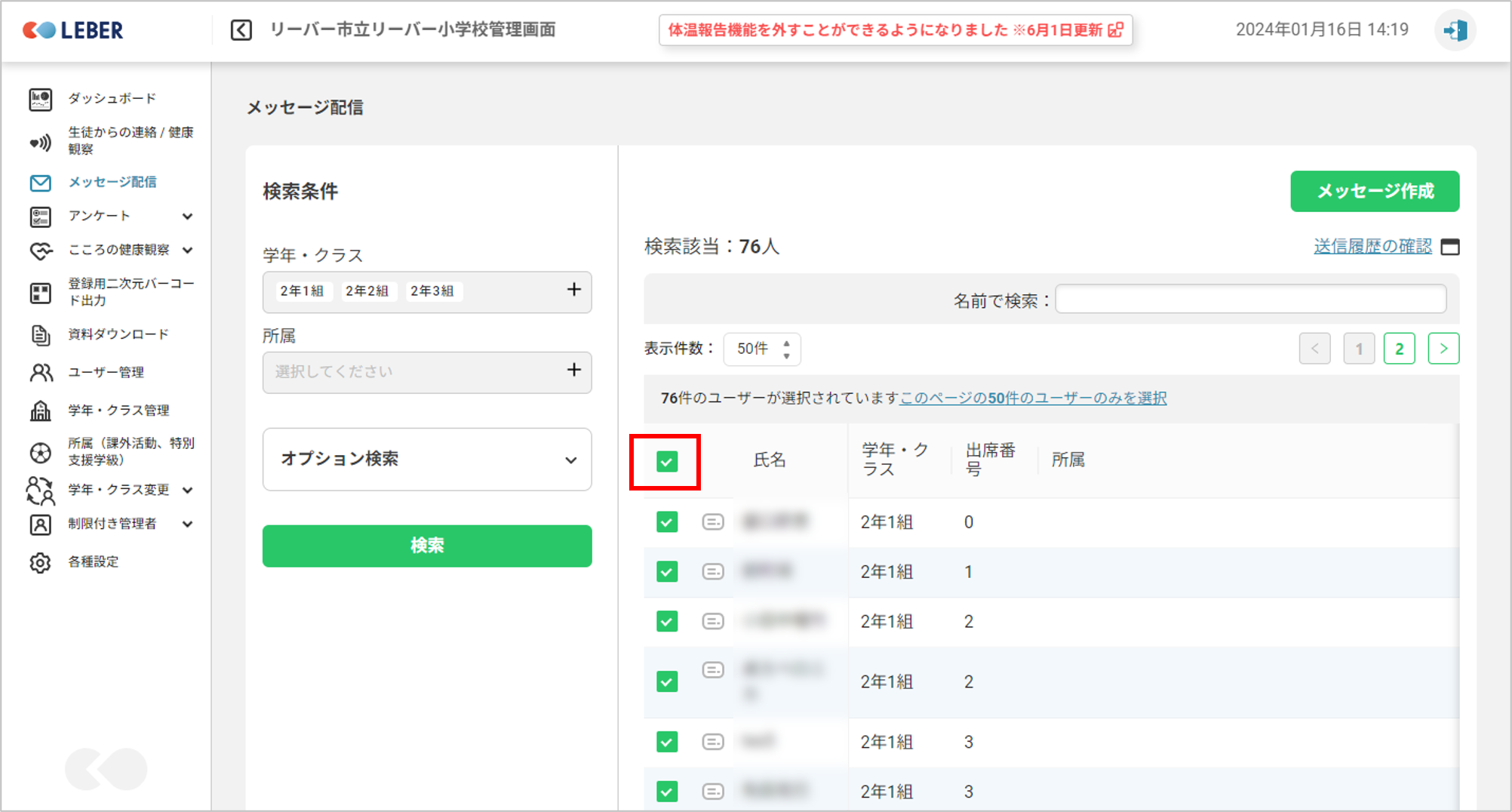 検索した全員に送信する場合は赤枠にチェックをつけます。