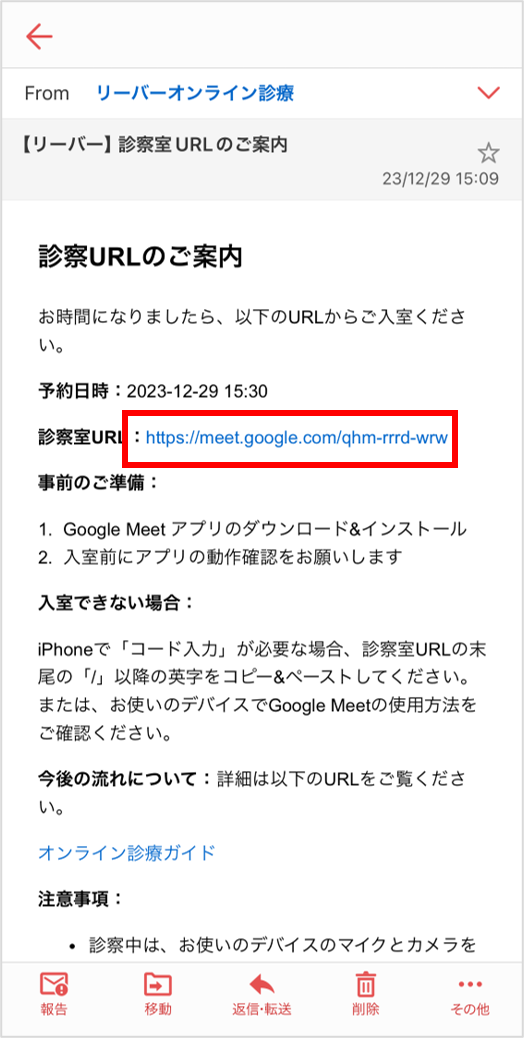 メールを開き、「診察室URL」を押します。