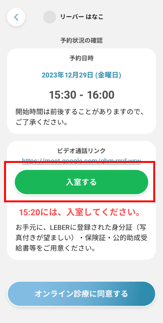 オンライン診療のビデオ通話は予約時間の10分前から入室可能となります。