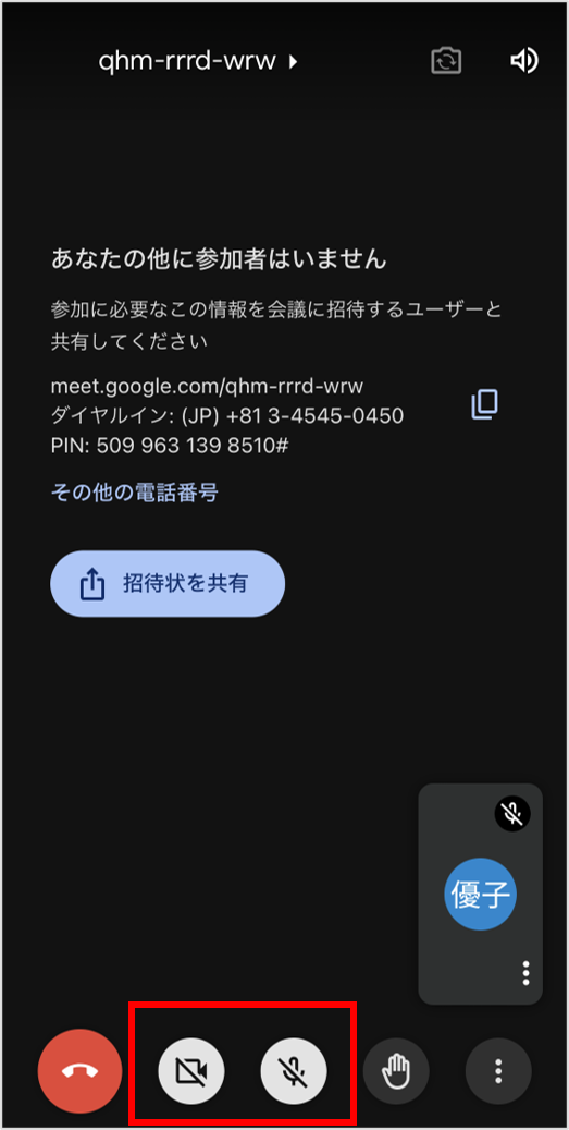 以下の赤枠でもビデオ通話の自分の映像表示・マイクのオンオフ切り替えが出来ます。