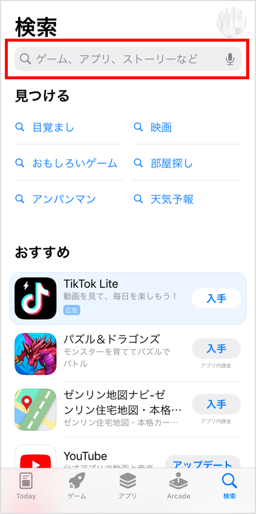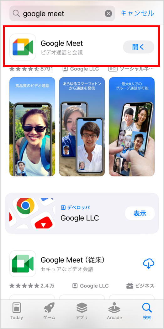 ①アプリストアを開き、検索ボックスに「GoogleMeet」と入力します。