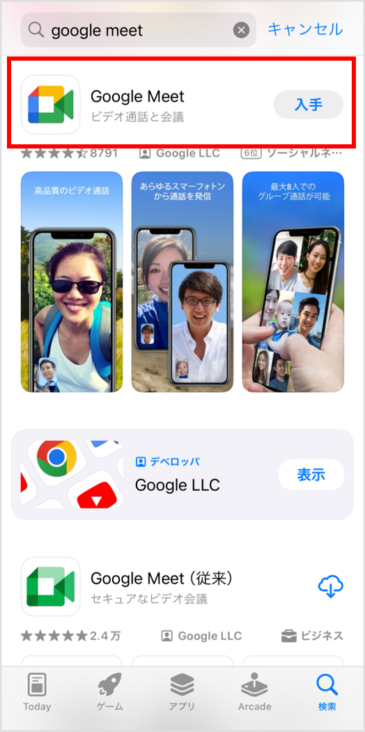 ②GoogleMeetをインストールします。(入手を押します。)