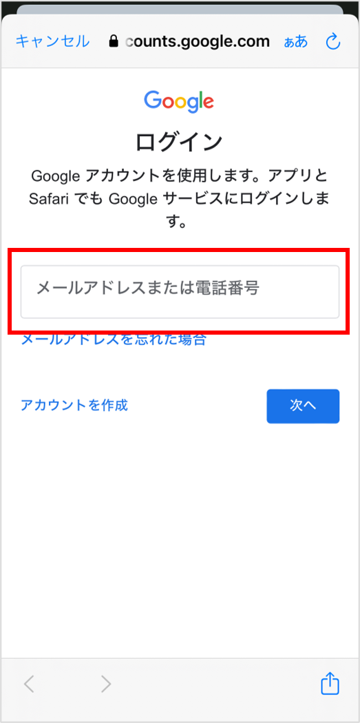 ⑤メールアドレスまたは電話番号を入力します。